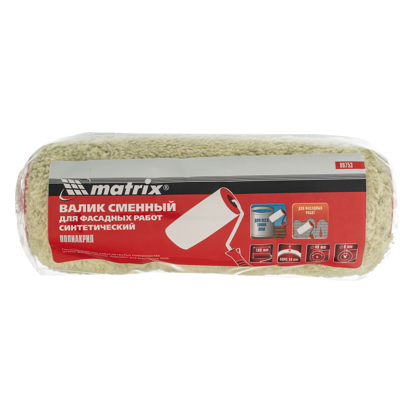 Валик сменный для Фасадных работ синтетический, 180 мм, ворс 18 мм, D 48 мм, D ручки 8 мм, полиакрил Matrix