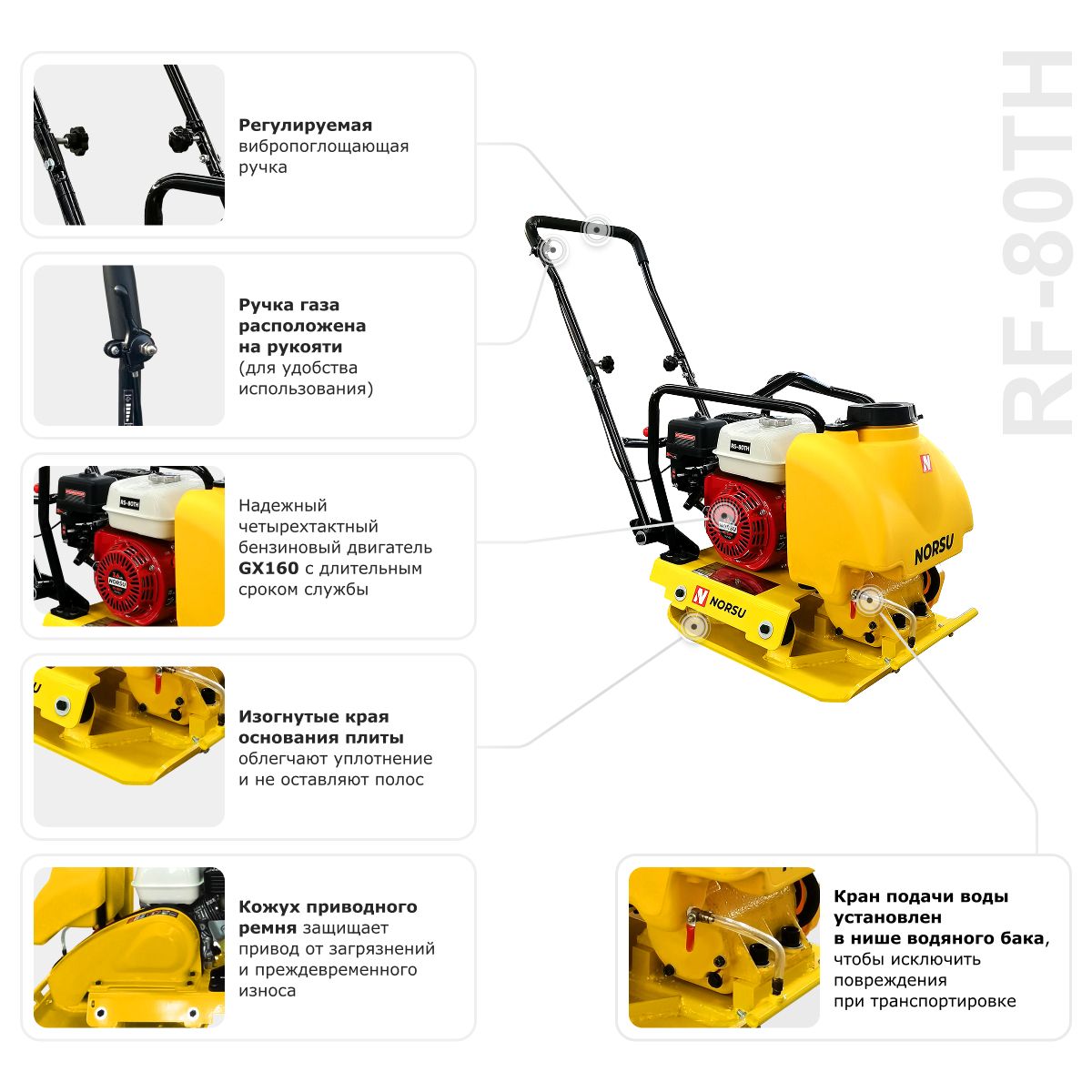 Виброплита бензиновая прямоходная NORSU RF-80TH (колесный комплект, бак для воды)