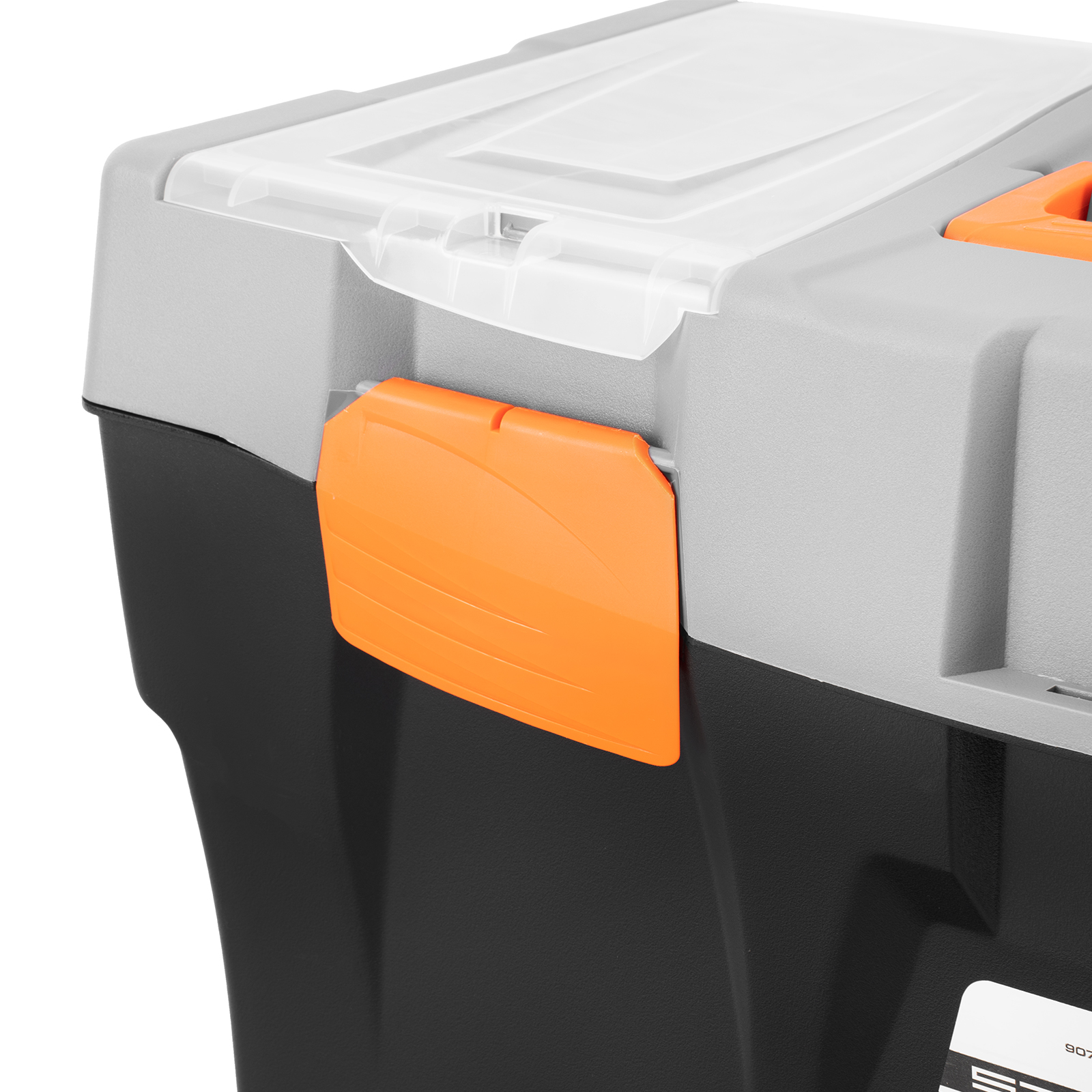 Ящик для инструмента Stels 90706, 23 дюймов, габаритами 590 х 300 х 300 мм, из пластика, предназначен для переноски и хранения инструментов, хозяйственных мелочей, рыболовных снастей. Содержимое не рассыпется, поскольку он надежно закрывается. Встроенные в крышку отделения обеспечивают быстрый доступ к крепежам и другим необходимым предметам. Большой ящик для хранения инструментов будет полезен дома, на даче, в гараже и на рыбалке.