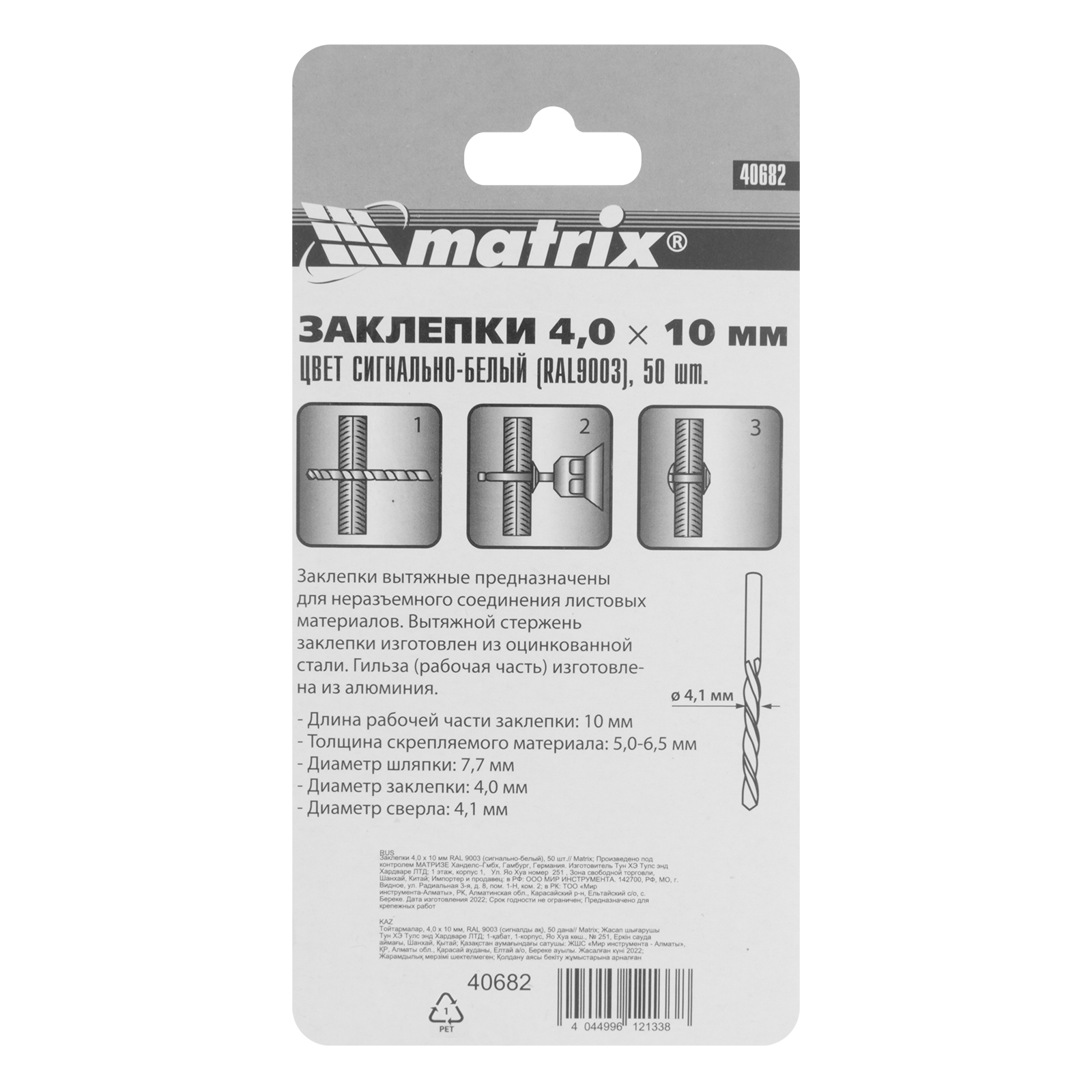 Заклепки 4.0 х 10 мм RAL 9003, сигнально-белые, 50 шт Matrix