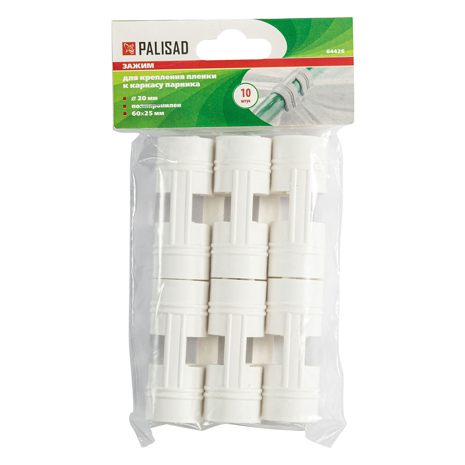 Белый зажим для крепления пленки к каркасу парника Palisad 64426, 10 шт., надежно фиксирует пленку или укрывной материал на дугах диаметром 20 мм. Он всегда пригодится в подсобном хозяйстве при сборке парников для выращивания растений.