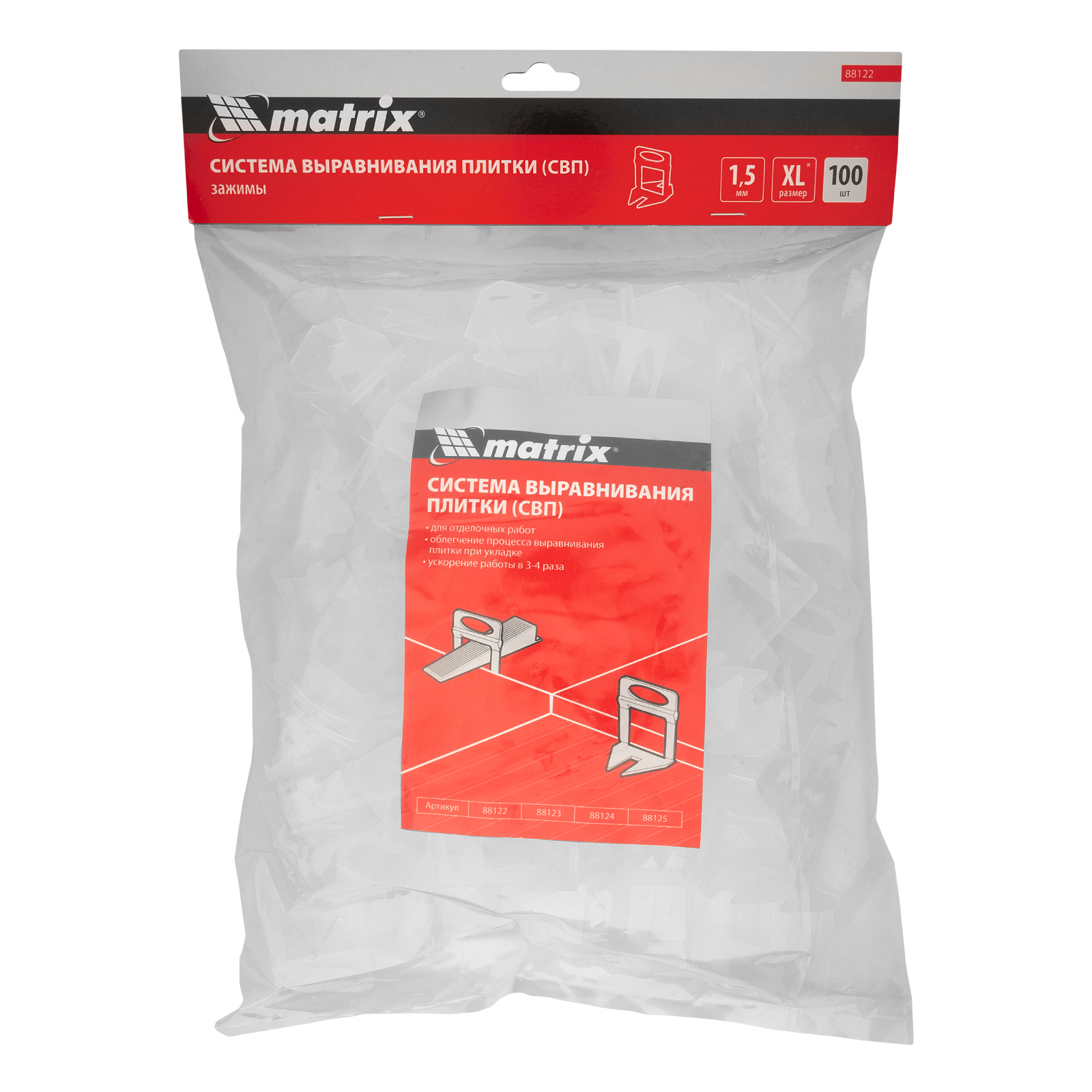 Система выравнивания плитки (СВП Ворота XL) Matrix 88122 состоит из зажимов (100 шт. в пакете), используемых совместно с клиньями Matrix 88123. Зажимы позволяют добиться качественного результата за счет того, что межплиточные швы получаются ровными и аккуратными, плитка не смещается, а клей распределяется равномерно. Зажимы для плитки (СВП) предназначены для формирования швов толщиной 1,5 мм при работе с керамической или керамогранитной плиткой.